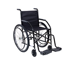 Em aço carbono, com assento/encosto em nylon, dobrável, freios bilaterais, aro impulsor bilateral, apoio para braços e pés fixos, rodas dianteiras aro 06...