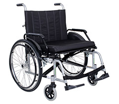 Em aço carbono com assento/encosto em nylon, dobrável, freios bilaterais, estrutura reforçada, aro impulsor bilateral, apoio...