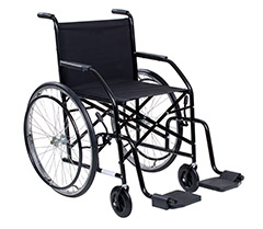 Em aço carbono, com assento/encosto em nylon, dobrável, freios bilaterais, aro impulsor bilateral, apoio para braços e pés fixos...
